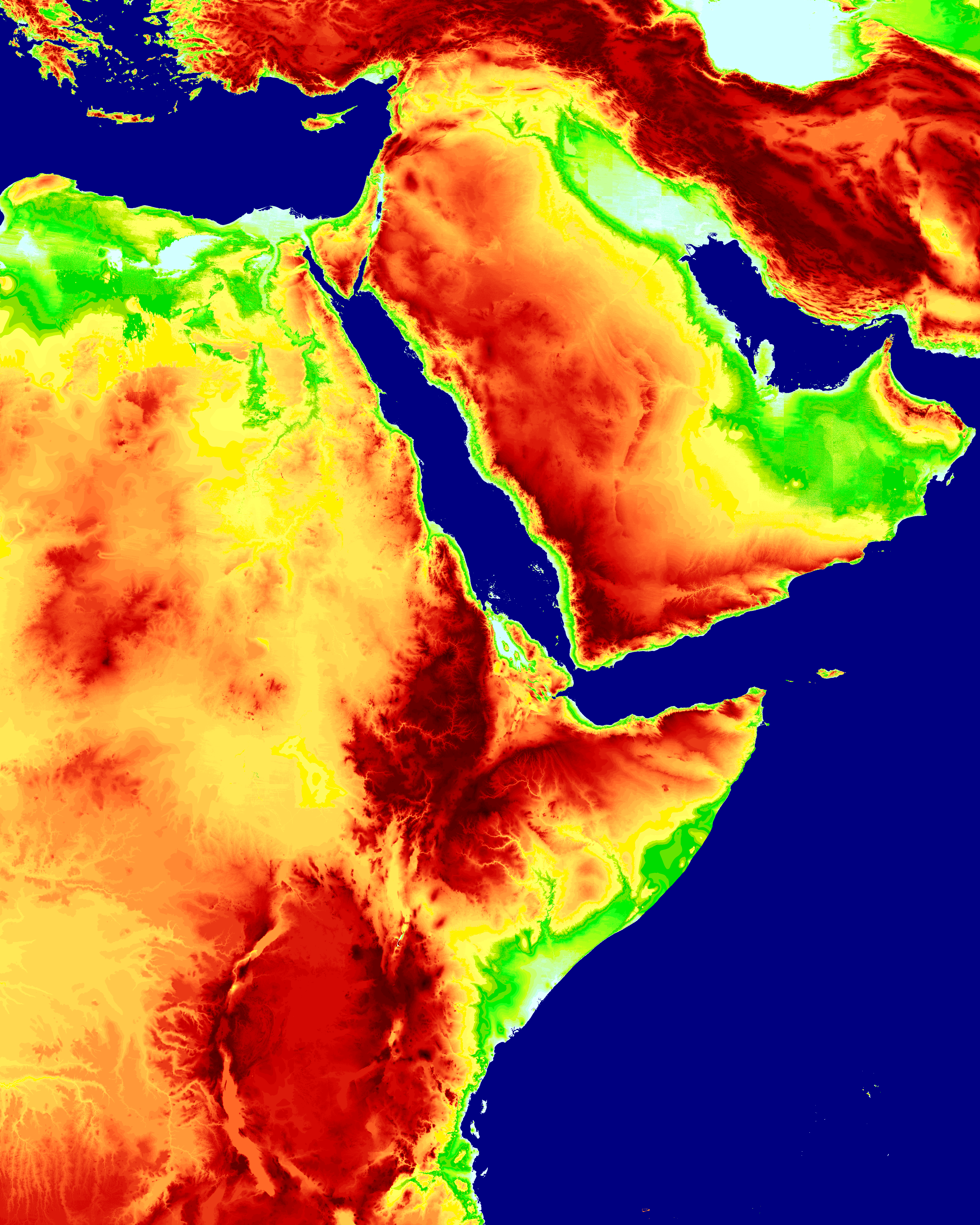 Actually they are not 'really' DEM files, in that their format is more like that of a HGT file. They have no A and B records, but are a simple set of 16-bit integers, in Motorola format, row by row, with no file header, but do have a separatate .HDR file which gives them their credentials. It was 'fun' sorting through LOTS of very 'faulty' documentaion to be able to output a good image. A sample of E020N40 is shown below - click image to load full size... to me it is absolute magic at full size!