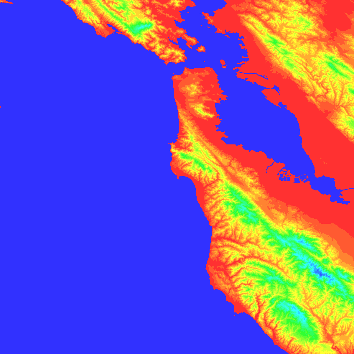 PNG image generated from N37W123.hgt from viewfinderpanoramas using my own developing dem3 app... Click image to load full size in a new window.