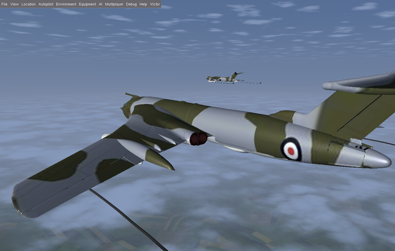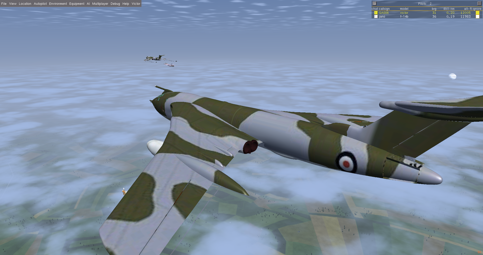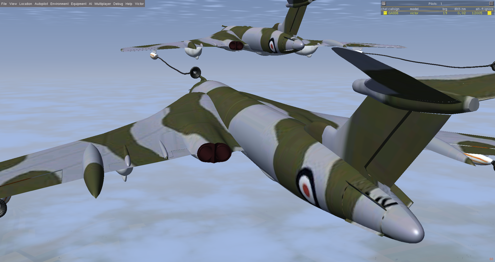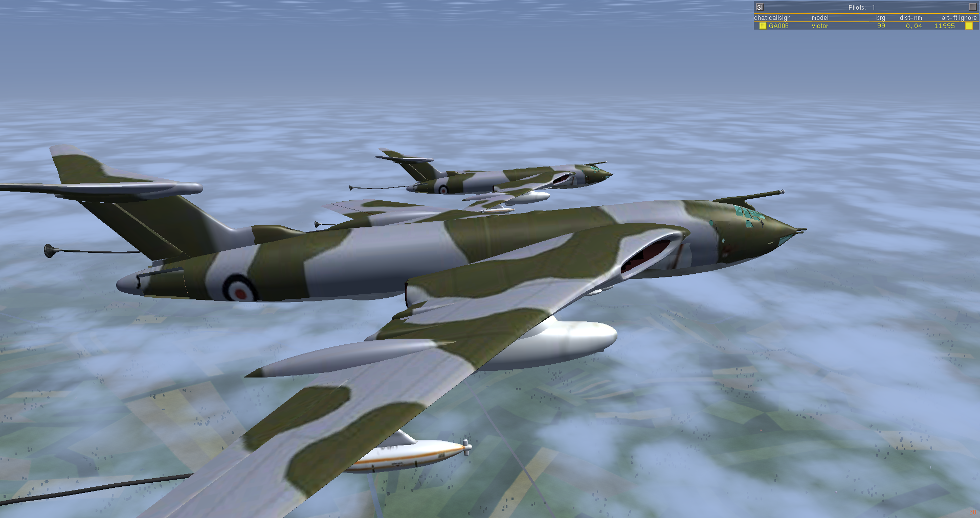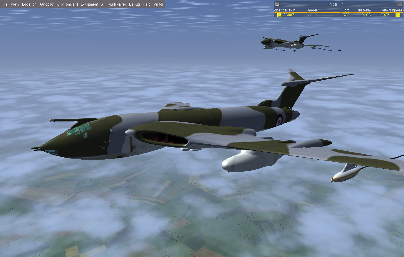 At times I also flew a second Victor as GA007, as observer and photgrapher, and below are some of the shots taken. Sometimes it is necessary to use a 3rd aircraft, since using F3 - take screen shot - either in the tanker or the aircraft to be refueled, really disturbs the fgfs mp packet flow, and the aircraft will slide back or forward - the so called rubber-band effect! And this can happen at other times, where the 'reason' is not so obvious.