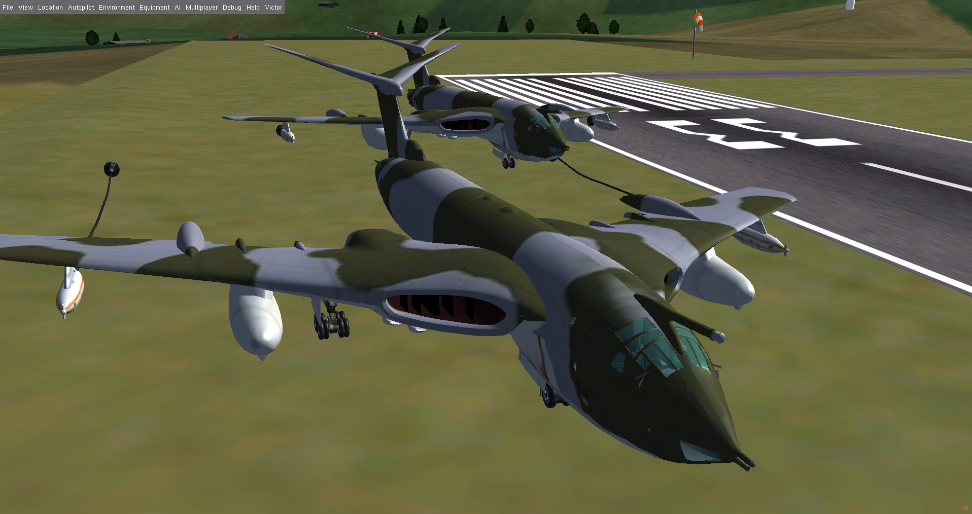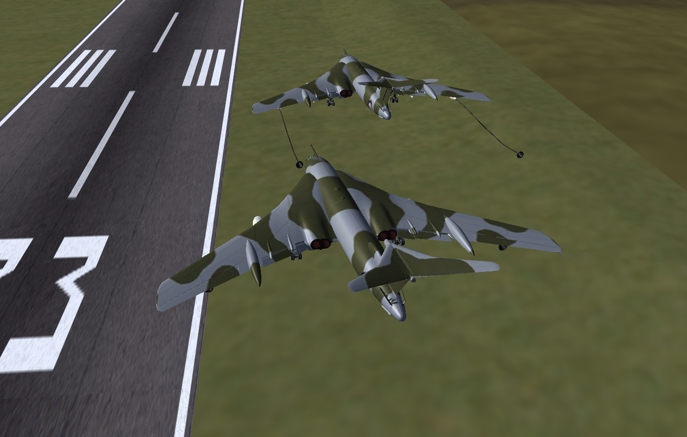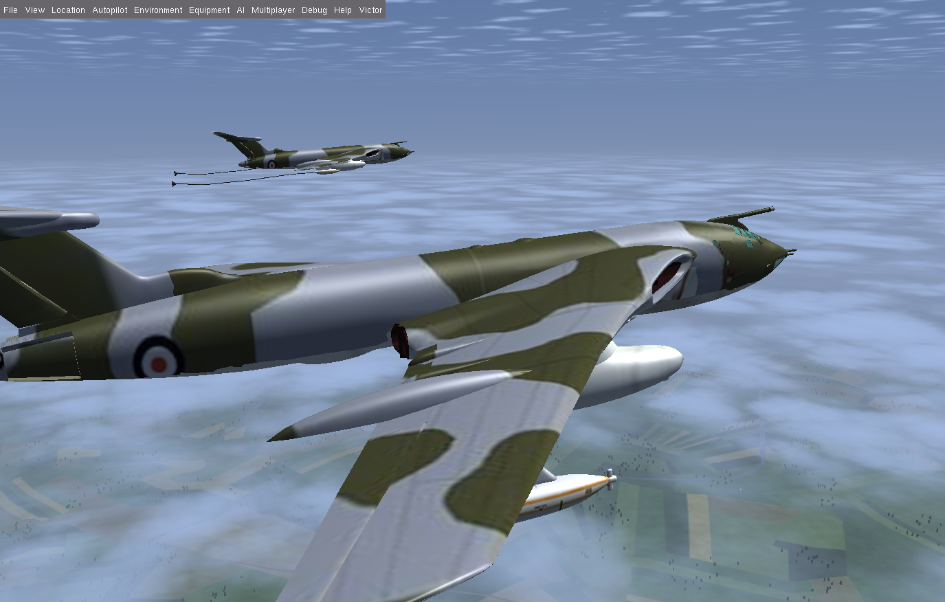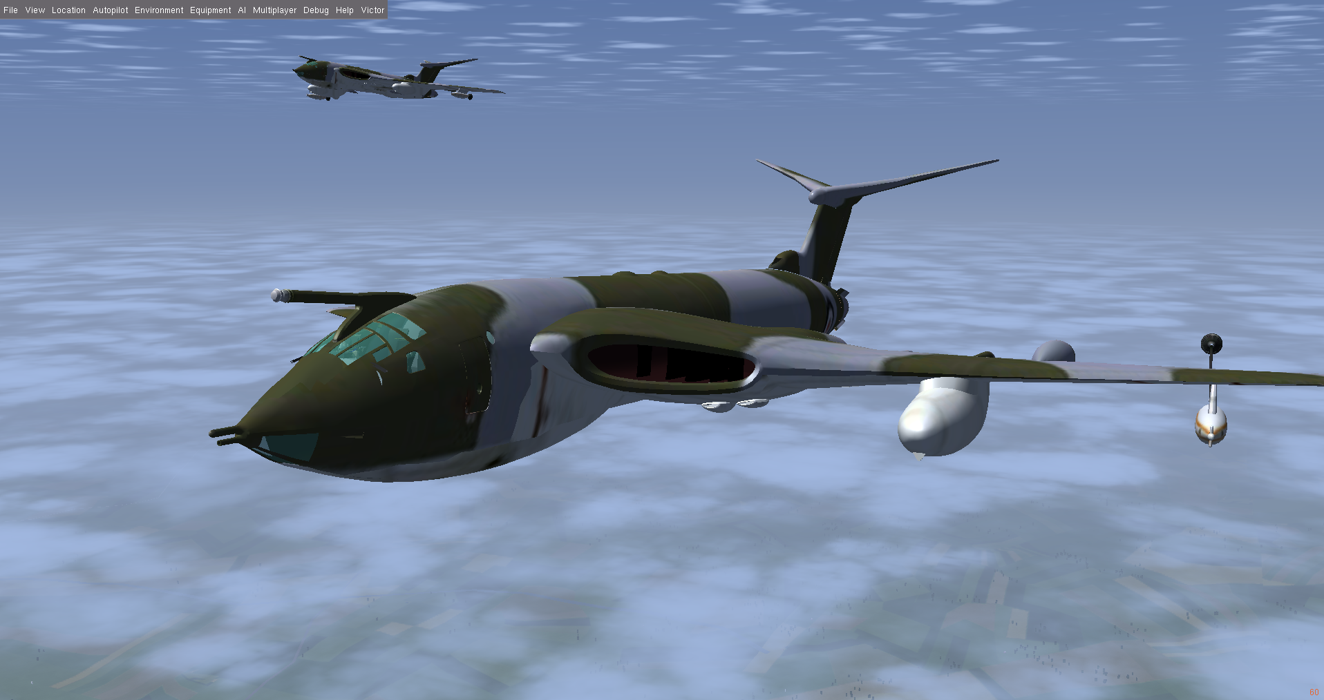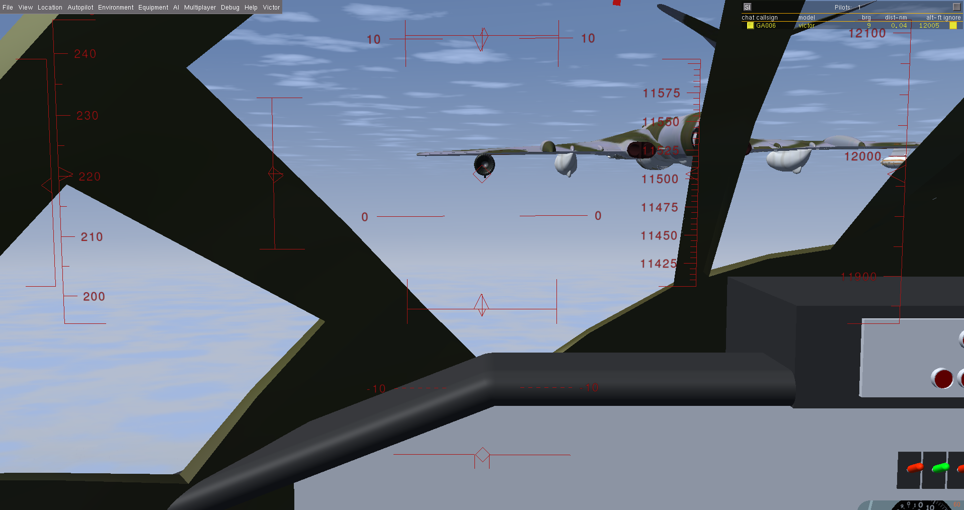 At times I also flew a second Victor as GA007, as observer and photgrapher, and below are some of the shots taken. Sometimes it is necessary to use a 3rd aircraft, since using F3 - take screen shot - either in the tanker or the aircraft to be refueled, really disturbs the fgfs mp packet flow, and the aircraft will slide back or forward - the so called rubber-band effect! And this can happen at other times, where the 'reason' is not so obvious.