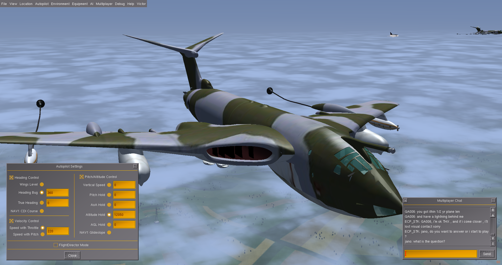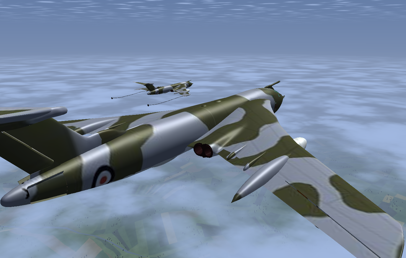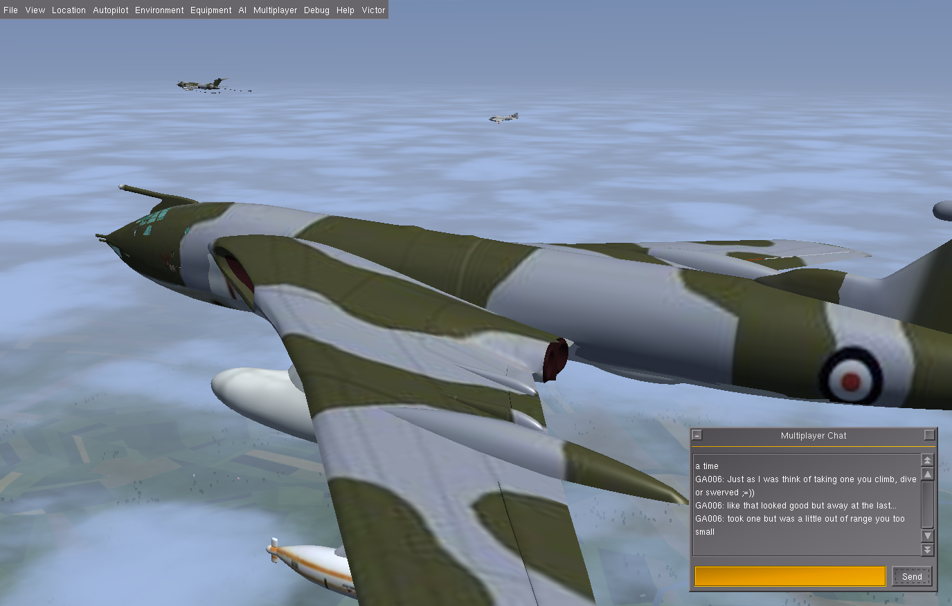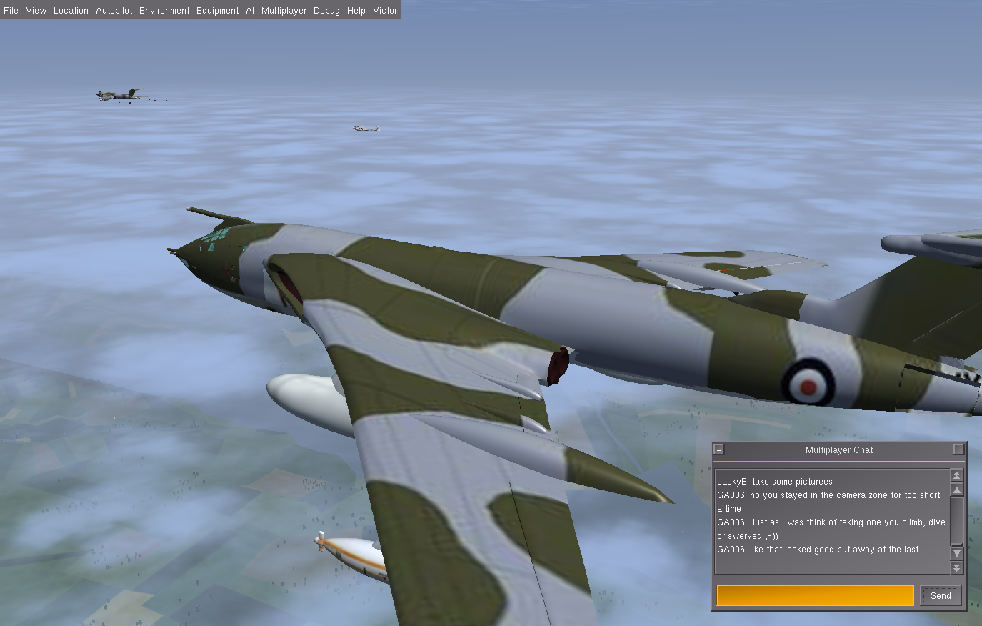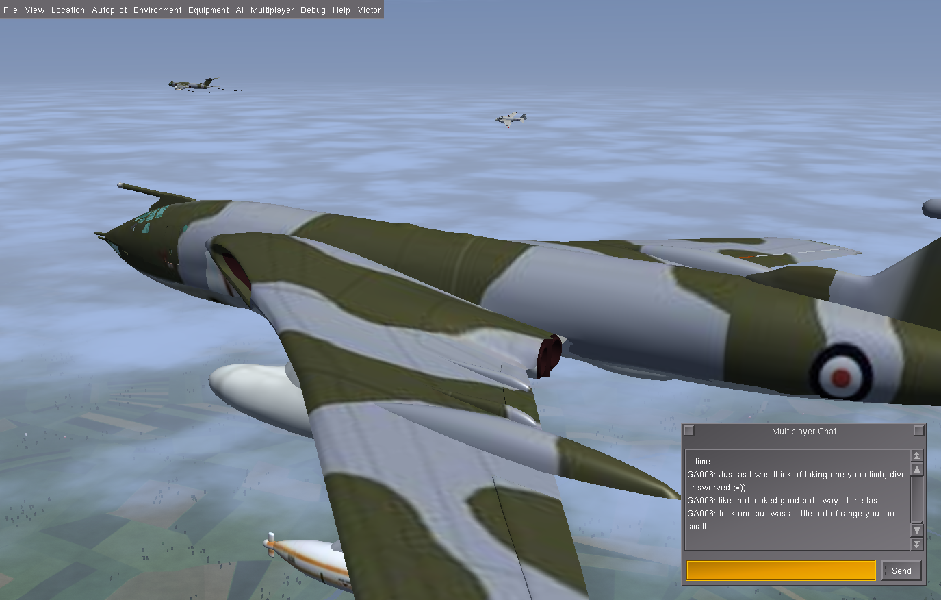 At times I also flew a second Victor as GA007, as observer and photgrapher, and below are some of the shots taken. Sometimes it is necessary to use a 3rd aircraft, since using F3 - take screen shot - either in the tanker or the aircraft to be refueled, really disturbs the fgfs mp packet flow, and the aircraft will slide back or forward - the so called rubber-band effect! And this can happen at other times, where the 'reason' is not so obvious.