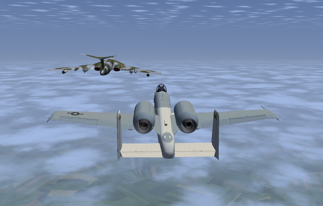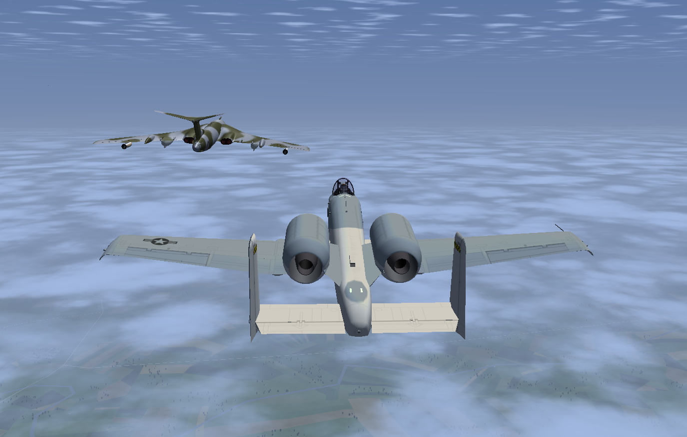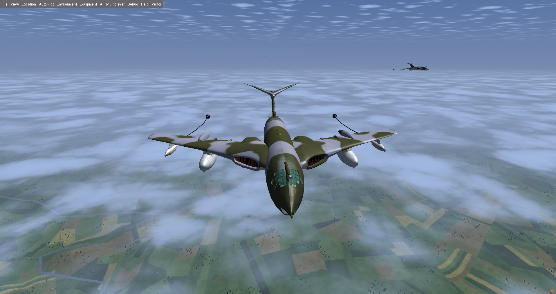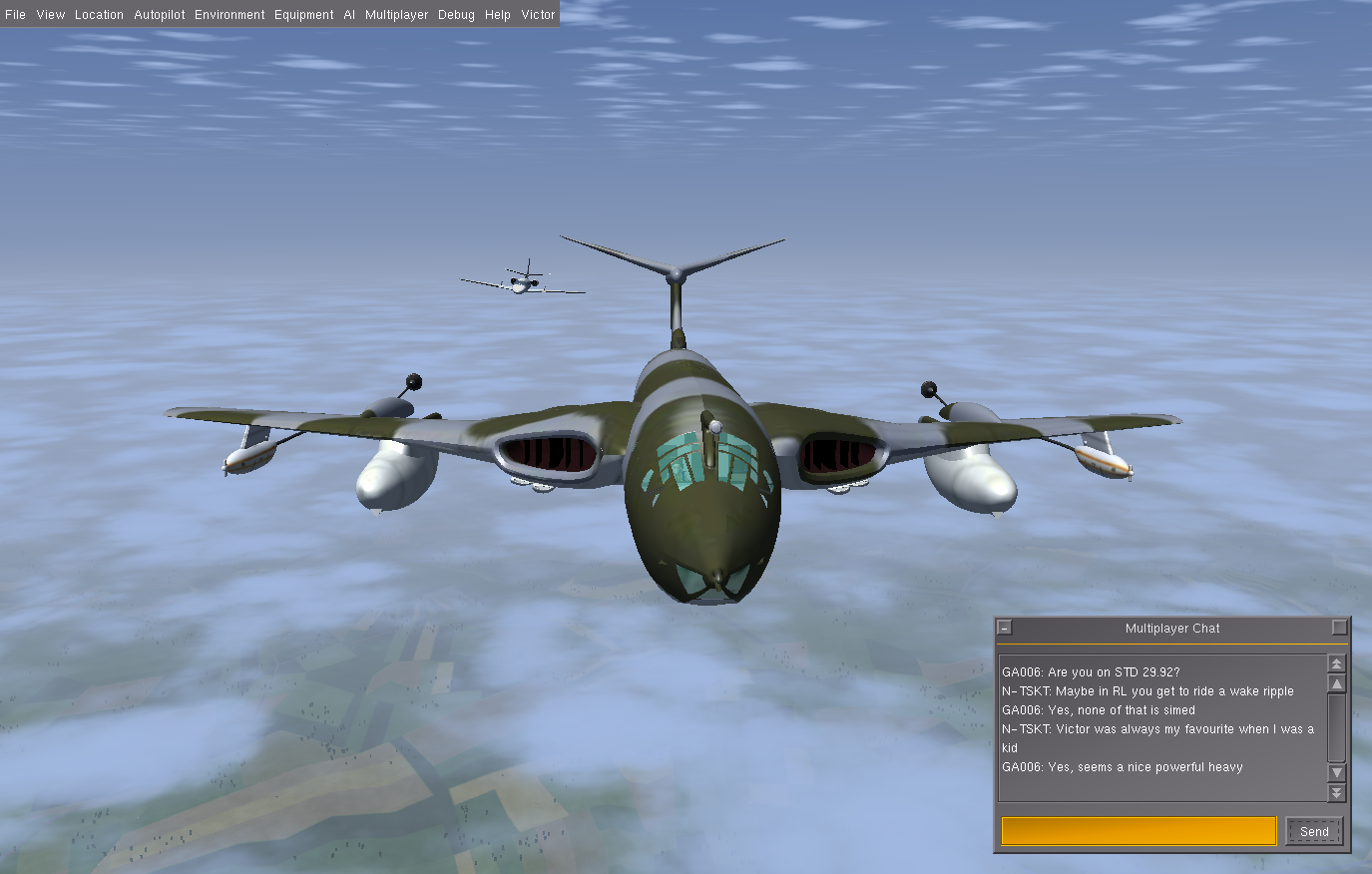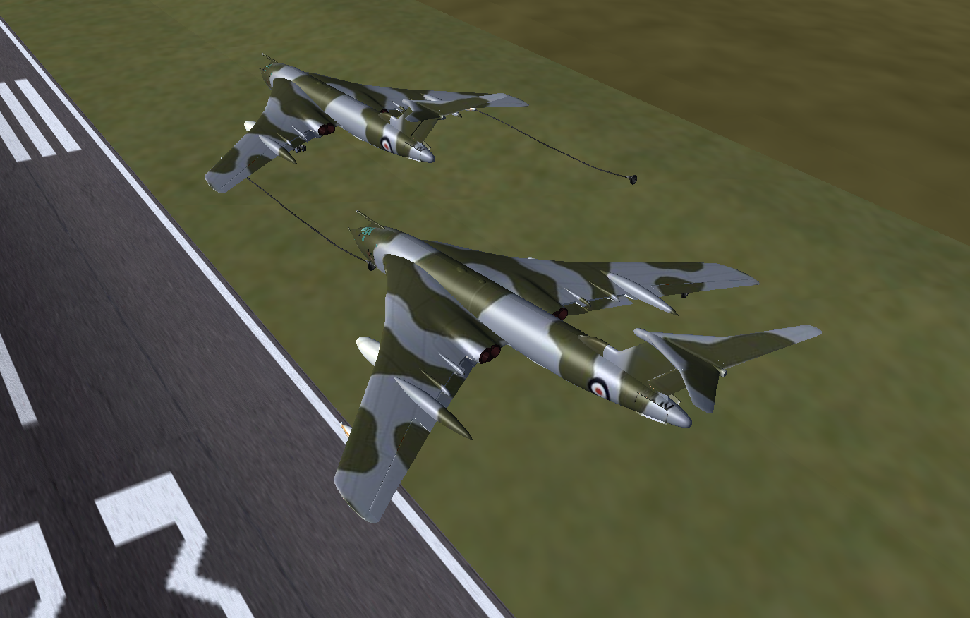 At times I also flew a second Victor as GA007, as observer and photgrapher, and below are some of the shots taken. Sometimes it is necessary to use a 3rd aircraft, since using F3 - take screen shot - either in the tanker or the aircraft to be refueled, really disturbs the fgfs mp packet flow, and the aircraft will slide back or forward - the so called rubber-band effect! And this can happen at other times, where the 'reason' is not so obvious.