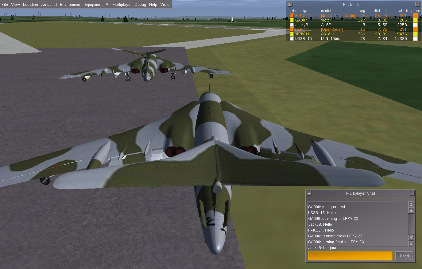 20130420: For the last few days I have been flying a refueling sortie, as GA006, from around noon until around 6 or 7 pm, in the Victor, by Alex Park, from LFPY (GMap) due South, until around Toulouse, then due North back to Paris, usually around 12,00 feet, travelling at 220 knots, and have been joined by a few others wanting to 'challenge' their flying skills.
